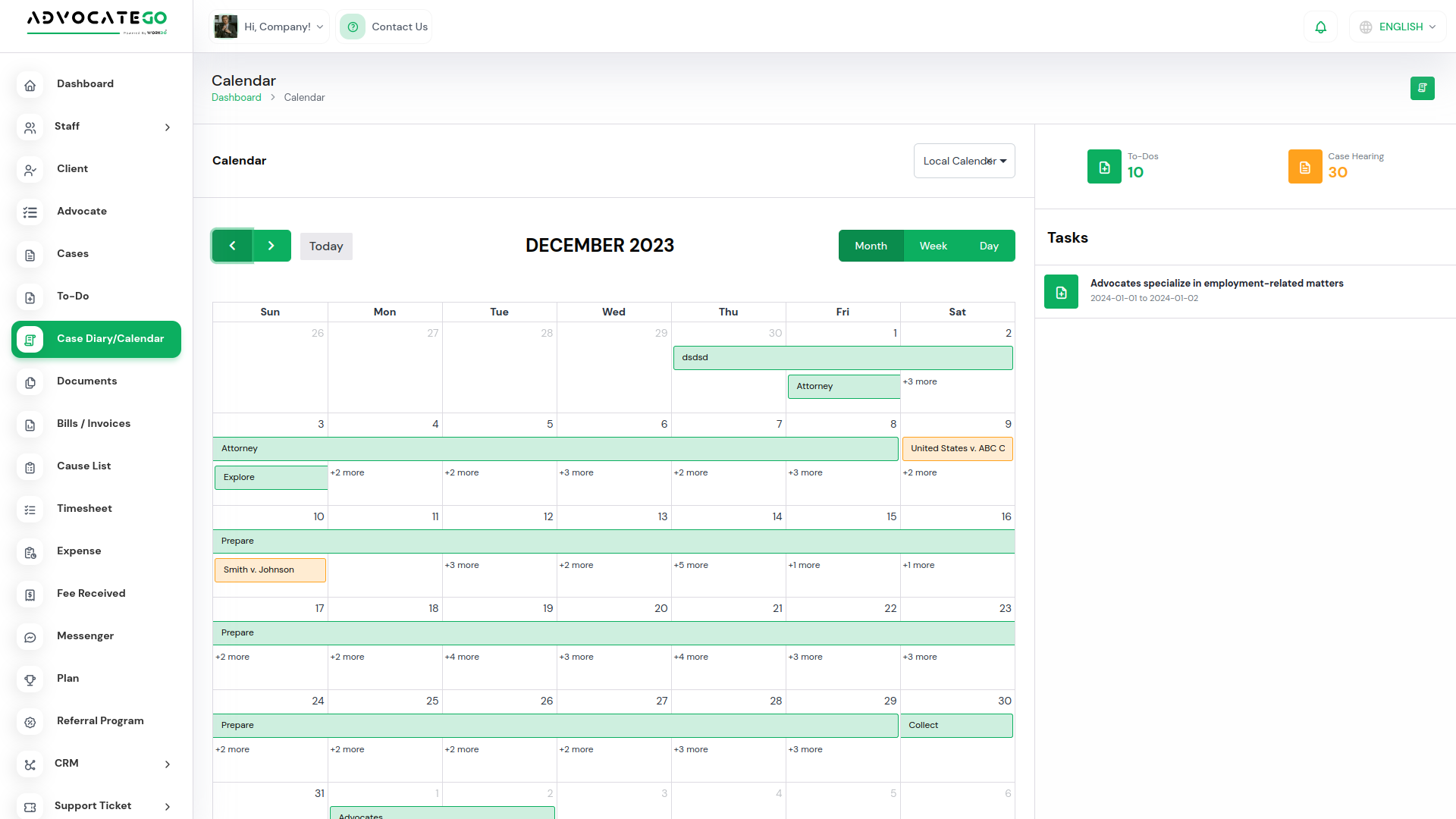 Provides a shared scheduling system for tracking court dates, deadlines, meetings, and reminders. It helps prevent missed appointments and ensures team coordination across all cases. This feature supports time management and case planning for the entire firm.